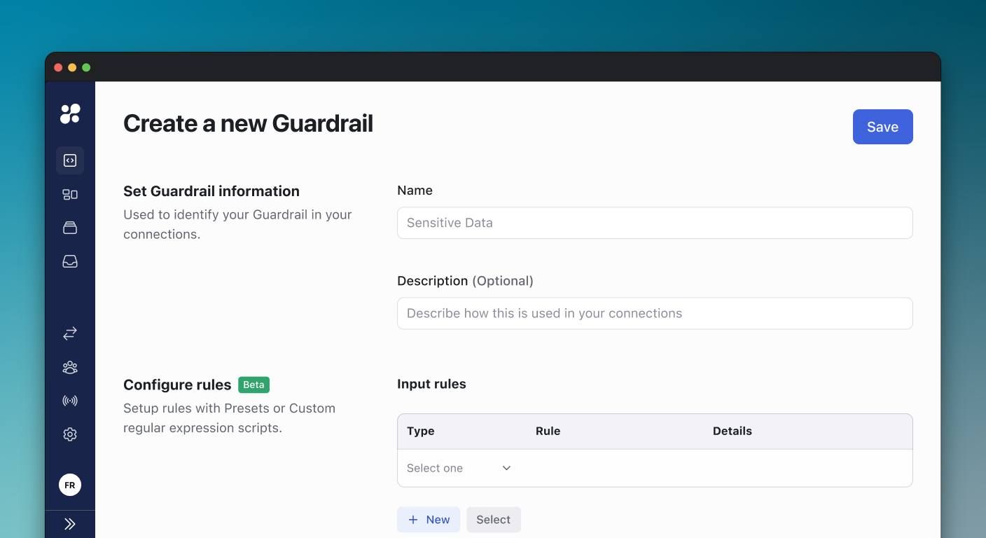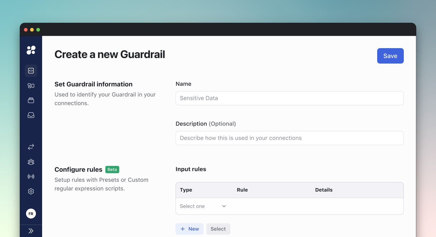 | Action | What to do when pattern matches | Redact, Block, Warn |